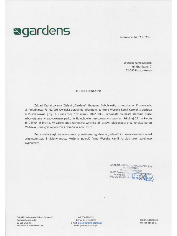Firma WYSOKO oficjalnie powstała w sierpniu 2017 roku, jednak usługami zakładania ogrodów i terenów zielni zajmujemy się od 2010 roku. Arborystyką zaczęliśmy się pasjonować od 2015 roku, szybko zdobywając wiedzę oraz praktykę w kraju i za granicą. Firmę reprezentują wykształceni, wykwalifikowani ogrodnicy i arboryści z wieloletnim doświadczeniem. Cechuje nas profesjonalizm, znajomość sztuki ogrodniczej, solidność oraz zamiłowanie do zawodu. Zależy nam, by końcowy efekt był satysfakcjonujący niezależnie od budżetu.