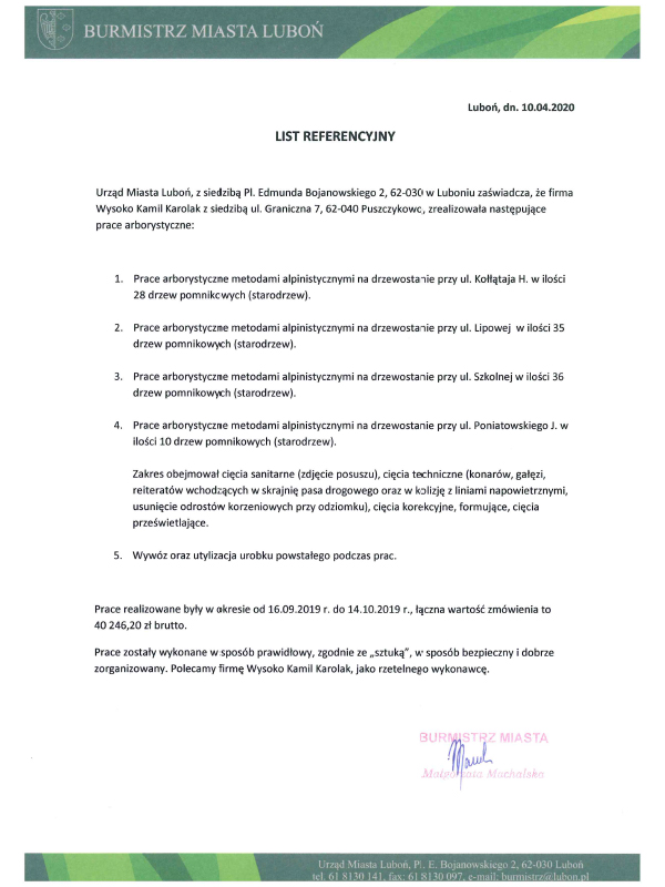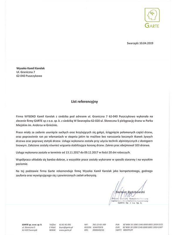 Posiadamy certyfikaty NPTC oraz European Tree Technician uprawniające do prac arborystycznych na całym świecie, dzięki czemu mają Państwo pewność, że powierzają zadanie prawdziwym profesjonalistom. Prace na drzewach wykonujemy metodami alpinistycznymi, dzięki którym jesteśmy w stanie dotrzeć w bardzo trudne miejsca. Oprócz tego wykazujemy czynne członkostwo w Federacji Arborystów Polskich. Gwarantujemy bezpłatną wycenę na podstawie wizji lokalnej oraz 100% recykling odpadów powstałych podczas prac. Posiadamy odpowiednie ubezpieczenie OC.